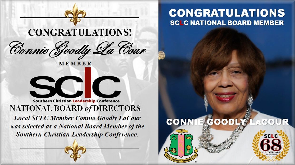 Connie Goodly is a native New Orleanian and the eldest daughter of ten siblings. She attended the New Orleans public schools, Xavier University, and Tulane University. Mrs. Goodly was hired by the United Teachers of New Orleans as the Director of Organizing. Her job involved recruiting members, training, and working with building representatives. Her services with SCLC began under National President Joseph Lowery.
