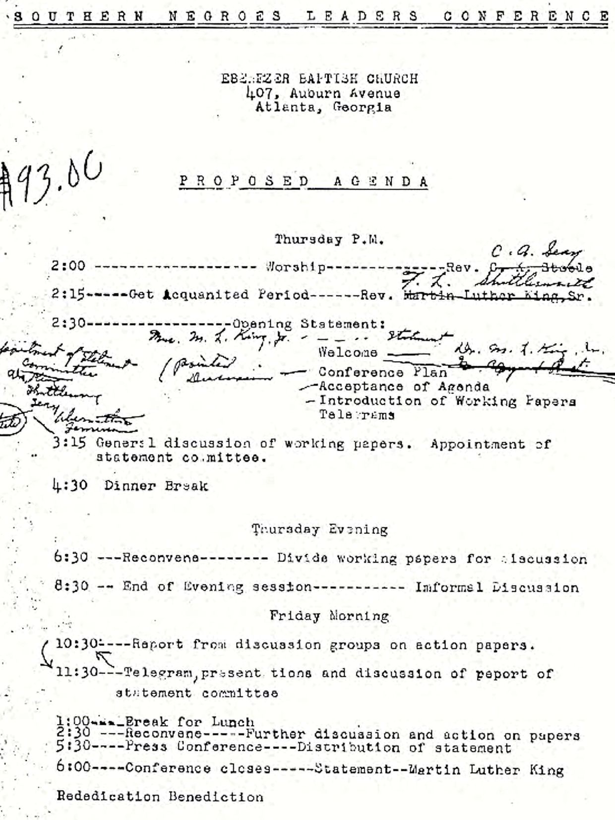 According to an early SCLC Brochure: the Elected Officers, Executive Board Members and Staff included: President, Rev. Dr. Martin Luther King, Jr. (GA); First Vice President, Charles Kenzie Steele, Sr. (FL); Second Vice President, Rev. Joseph Echols Lowery (AL); Third Vice President, Rev. Samuel Woodrow Williams (GA); Fourth Vice President, Dr. Cuthbert Ormond Simpkins, Sr. (LA); Secretary, Rev. Fredrick Lee “Fred” Shuttlesworth (AL); Treasurer, Rev. Dr. Ralph David Abernathy (AL); Chaplain, Rev. Kelly Miller Smith (TN); Historian, Dr. Lawrence Dunbar Reddick (MD); and Legal Counsel, Atty. Israel Meyer Augustine (LA). EXECUTIVE BOARD MEMBERS: Rev. Henry C. Bunton (TN), Rev. Abraham Lincoln Davis, Jr. (LA), Rev. W.A. Dennis (TN), R.L. Drew (MS), Rev. Edward T. Graham (FL), Rev. Walter L. Hamilton (VA), Rev. W.L. Hall (GA), Aaron E. Henry (MS), Clarence Henry (LA), Rev. Benjamin Lawson Hooks, Esq. (TN), Rev. Dearing E. King, Sr. (KY), Rev. Martin L. King, Sr. (GA), Isaac Samuel Leevy (S.C.), Rev. Matthew D. McCollum (S.C.), Rev. Solomon Snowden Seay, Sr. (AL), Rev. R.B. Shorts (GA), W.E. Shortridge (AL), Rev. Nelson H. Smith (AL), Rev. Roland Smith (AR), Rev. Daniel B. Speed (FL), Rev. Melvin Chester Swann (N.C.), and Rev. Robert G. Williams (VA). Rev. Theodore Judson Jemison (LA) also served on the Executive Board. The 1957 SCLC STAFF: Executive Director, Dr. John L. Tilley (MD); Public Relations Director, James R. Wood; Educational Consultant, Dr. Dorothy Foreman Cotton (VA); Staff Consultant, Rev. James M. Lawson, Jr. (TN); and, Field Secretary, Rev. Harry Blake (LA).